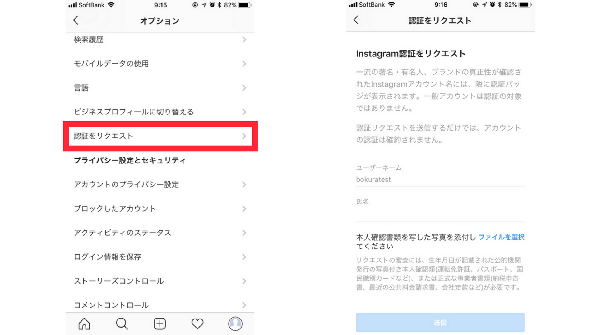 <STEP1> Instagramアプリのオプション画面から「認証をリクエスト」をタップ