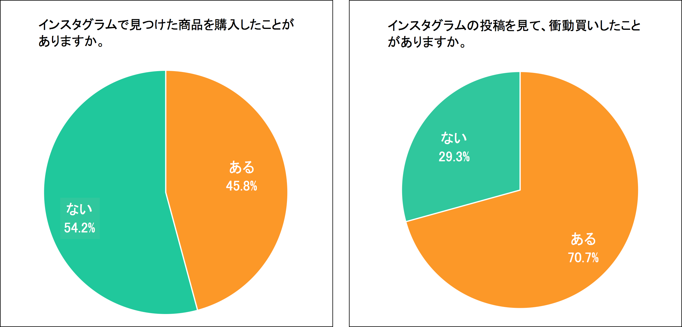 Q. インスタグラムの投稿を見て、衝動買いしたことがありますか? → A. ある:70.7% ない:29.3%