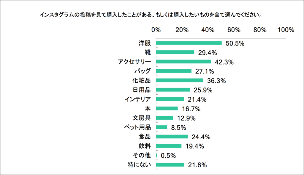 ・「Instagramの投稿を見て購入したことがある、もしくは購入したいもの」は「洋服」、「アクセサリー」、「化粧品」、「靴」、「バッグ」などのファッションアイテムが上位を占める。一方で「食品」や「飲料」など「インスタ映え」しやすい商材も購入対象になりやすいこともわかった。
